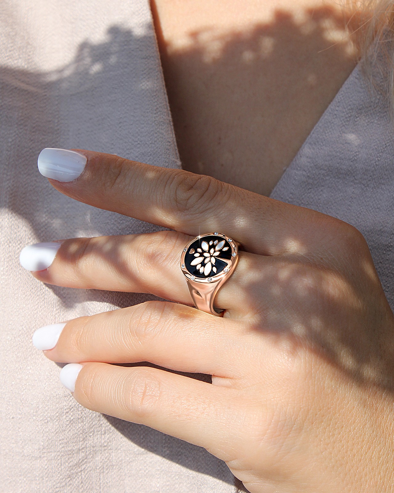 Sa forme chevalière épouse à la perfection son motif, contrasté par l'association de son noir intense et du rose gold de sa monture.
