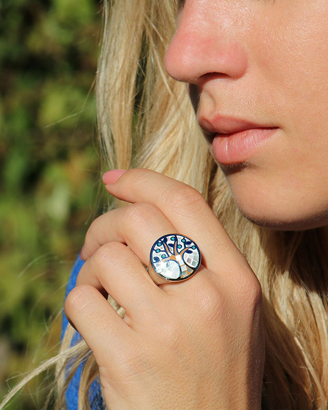 En acier émaillé et serti de nacre, sa forme arrondie fait ressortir toute la beauté de son motif au centre de la pièce. Vous pouvez associer cette bague à notre bracelet Italus marrone qui reprend les mêmes motifs et ainsi constituer une parure qui s'accordera parfaitement.