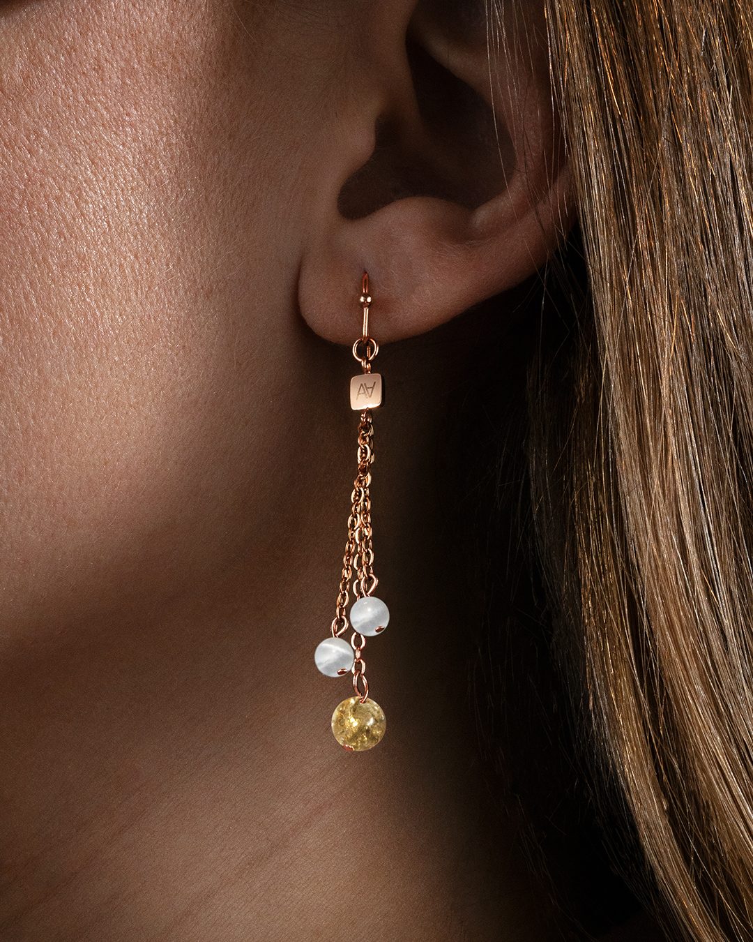 L'énergie solaire de la Citrine s'entrelace avec la douceur luminescente de la Sélénite, faisant de ces boucles d'oreilles un talisman d'équilibre et d'harmonie pour le corps et l'esprit. Cette association rappelle le jeu perpétuel entre le yin et le yang, entre la force dynamique et la quiétude réconfortante.