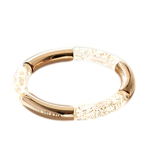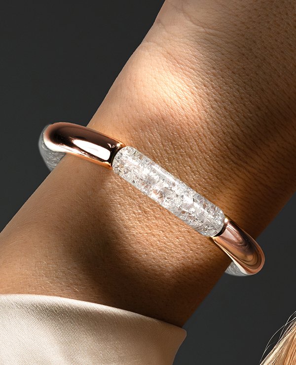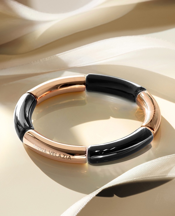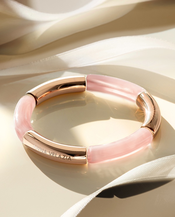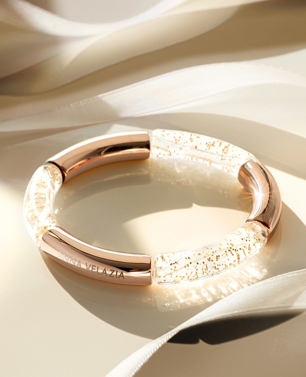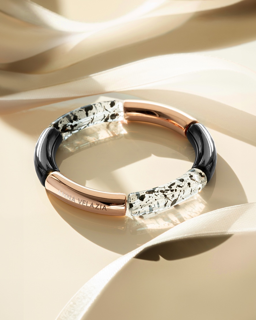 Le bracelet est composé de six éléments raffinés : trois pièces en acétate transparent au fascinant effet craquelé, qui apportent une touche contemporaine et sophistiquée, et trois pièces en acier rosé inoxydable, alliant robustesse et éclat. La pièce centrale, gravée à la main du nom Anna Velazia, souligne l’exclusivité et l’authenticité de cette création.
