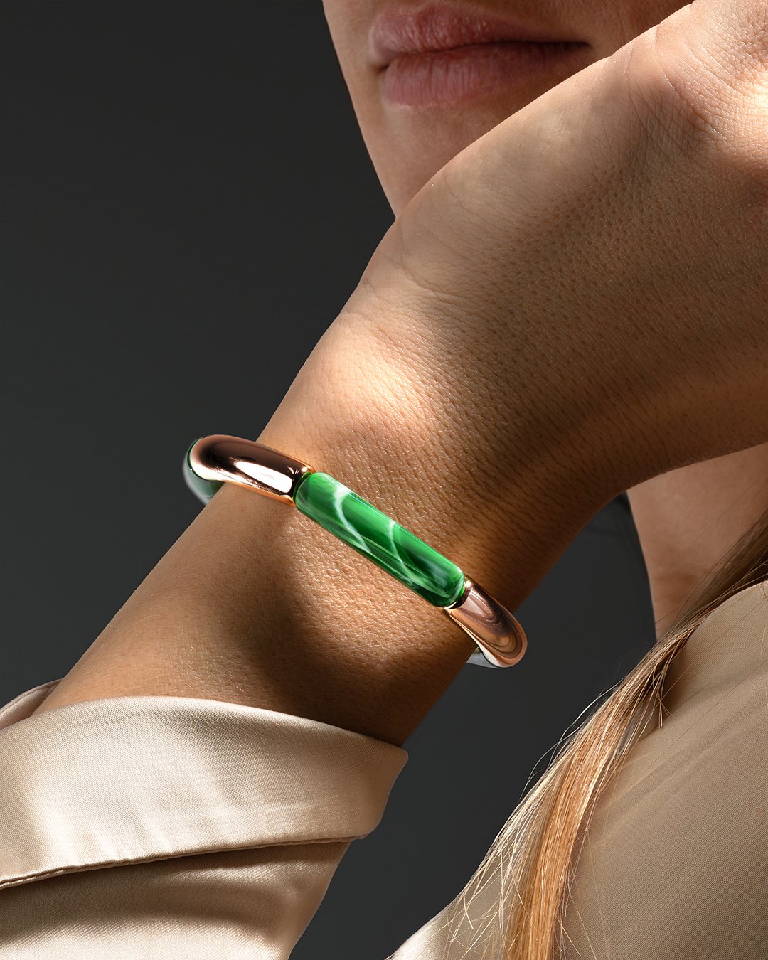 Le bracelet est composé de six éléments raffinés : trois pièces en acétate vert céladon marbré, qui apportent une touche sophistiquée et naturelle, et trois pièces en acier rosé inoxydable, alliant robustesse et éclat. La pièce centrale, gravée à la main du nom Anna Velazia, souligne l’exclusivité et l’authenticité de cette création.