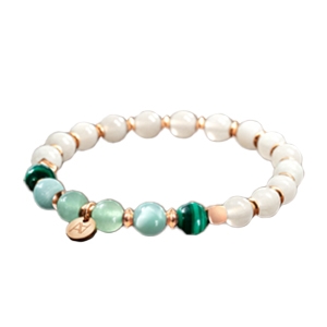 Les perles naturelles sont séparées par de délicats séparateurs en acier doré rosé à l’or fin, dont l’éclat met en valeur les reflets flamboyants du bracelet. La médaillon signée Anna Velazia scelle ce bijou d’une touche de grâce et d’authenticité.