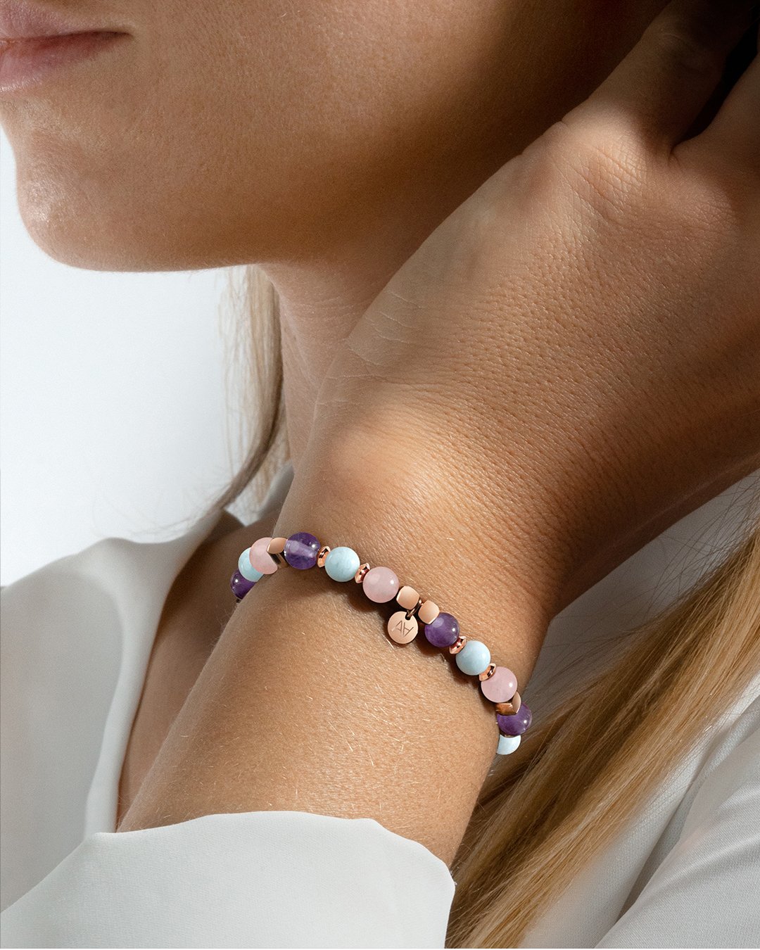 Quelle union exceptionnelle que celle du Quartz Rose, de l'Aigue Marine et de l'Améthyste ! Ces minéraux, si délicatement associés, forment un mélange puissant pour guider le cœur et l'esprit vers une harmonie profonde dans les relations.