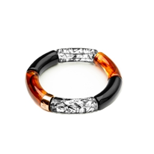 Le bracelet se distingue par son assemblage audacieux : un élément pailleté doré qui capte la lumière, des pièces en acétate ambre orangé lumineuses, un segment vert olive à l’élégance naturelle, ainsi que des nuances blanc pur et blanc marbré qui apportent éclat et équilibre.