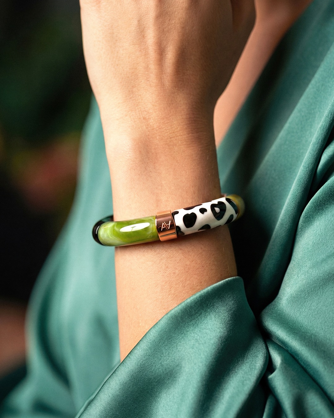 Laissez-vous séduire par ce bracelet en acétate artisanal, symbole d’un luxe accessible et d’une mode responsable.
