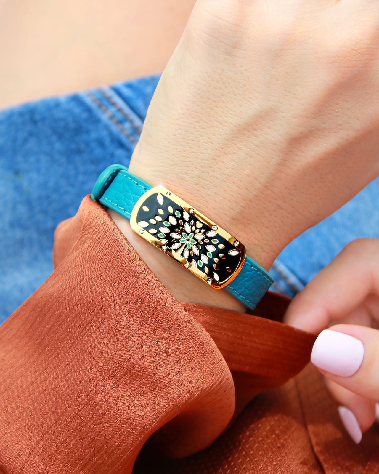 Le bleu turquoise de son bracelet cuir met en valeur l'acier doré du bijou pour en faire un accessoire tendance.