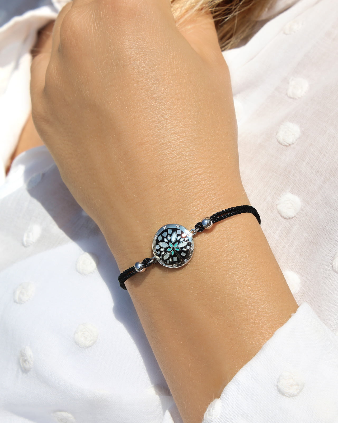 Le noir de son bracelet en coton fait ressortir la beauté de ce bijou tout offrant une touche de couleur à votre tenue.