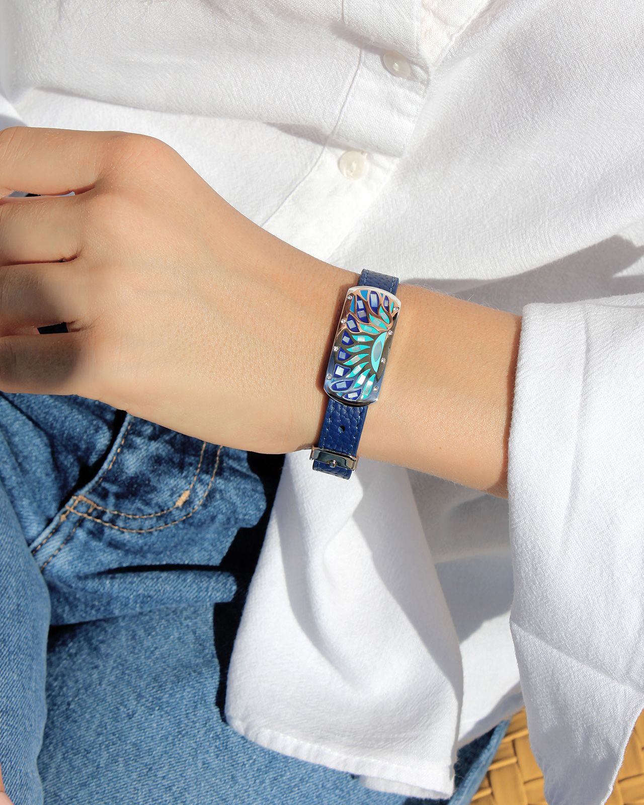 Le bleu gris de son bracelet cuir illuminera avec raffinement votre poignet.