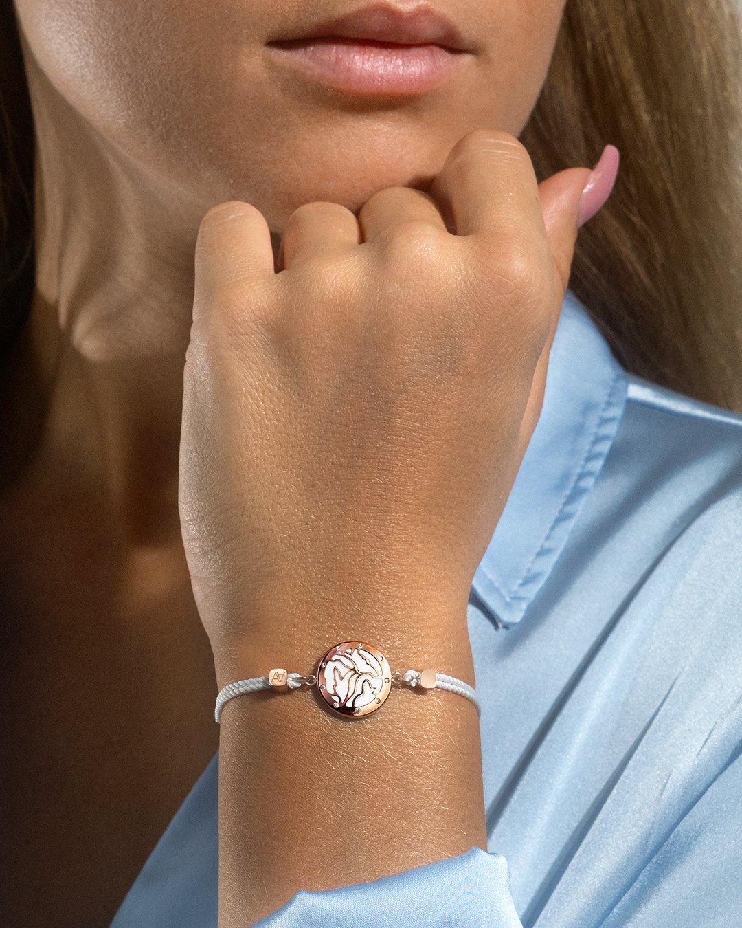 Son bracelet en coton combiné à sa chaîne viendra somptueusement s'allier avec vos looks du quotidien.