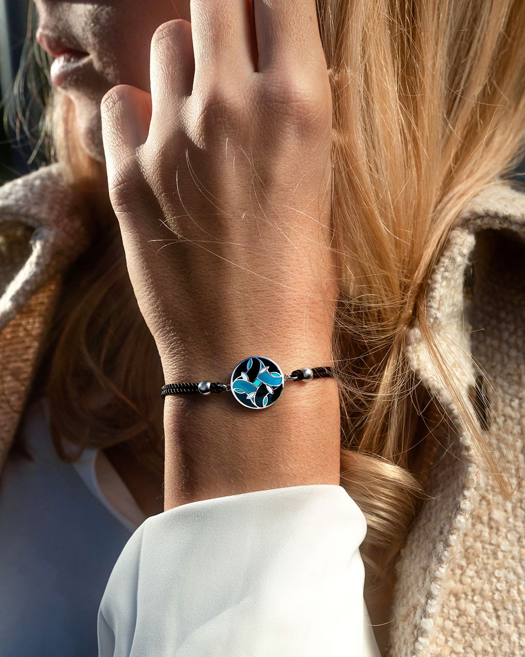 Le noir de son bracelet coton vient délicatement contrasté son médaillon pour un rendu unique. Il viendra avec élégance compléter tous vos looks !