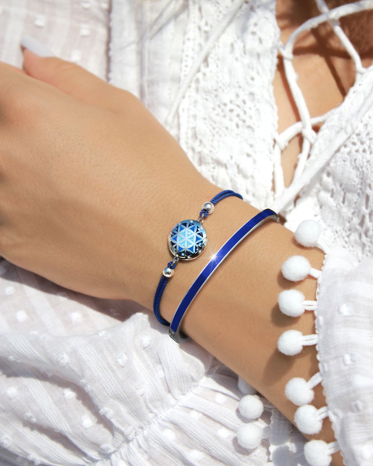 Le bleu marine de son bracelet coton vient sublimer cette pièce riche en signification.