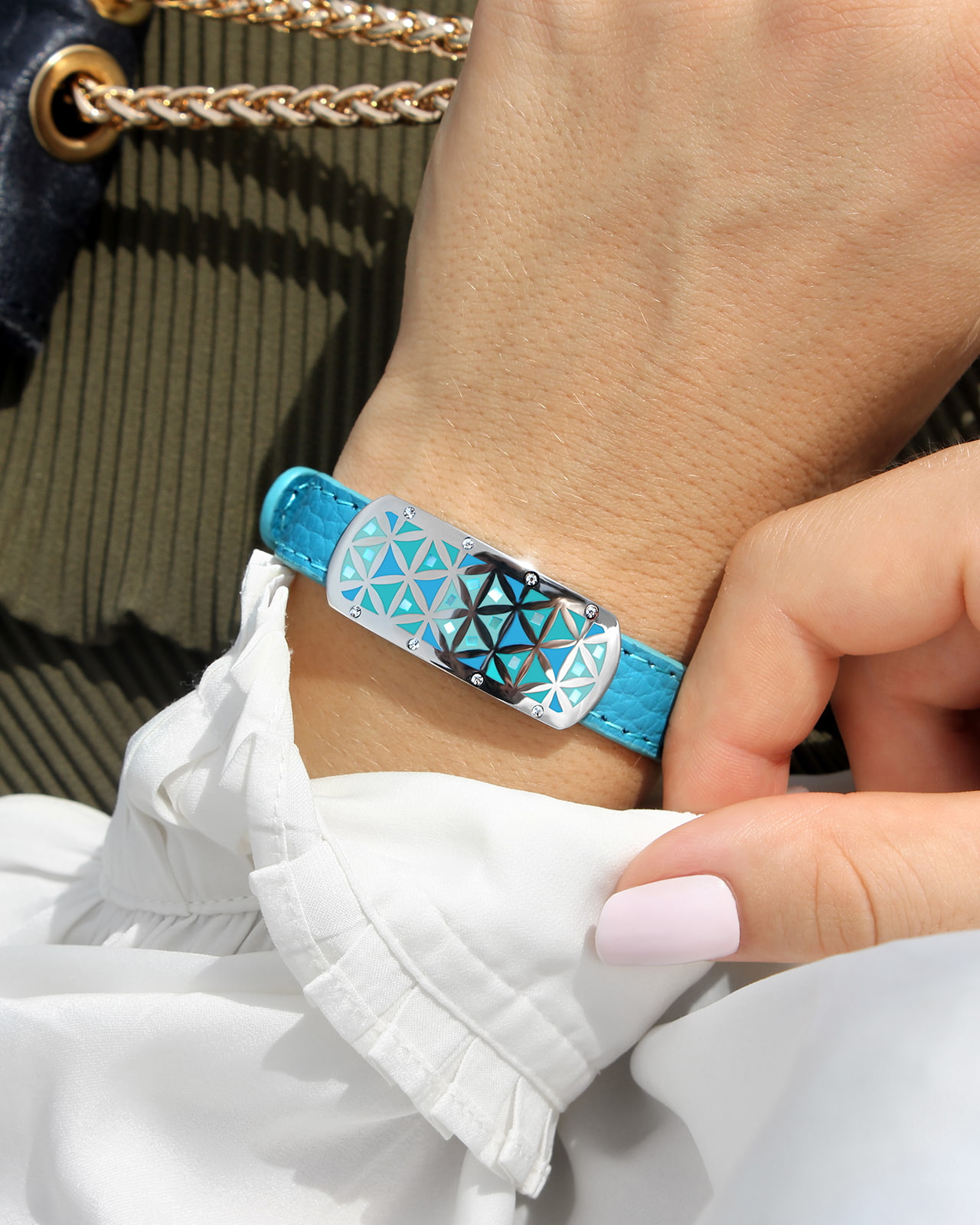 Le bleu turquoise de son bracelet cuir vient transcender cette pièce riche en signification. Il illuminera avec raffinement votre poignet.