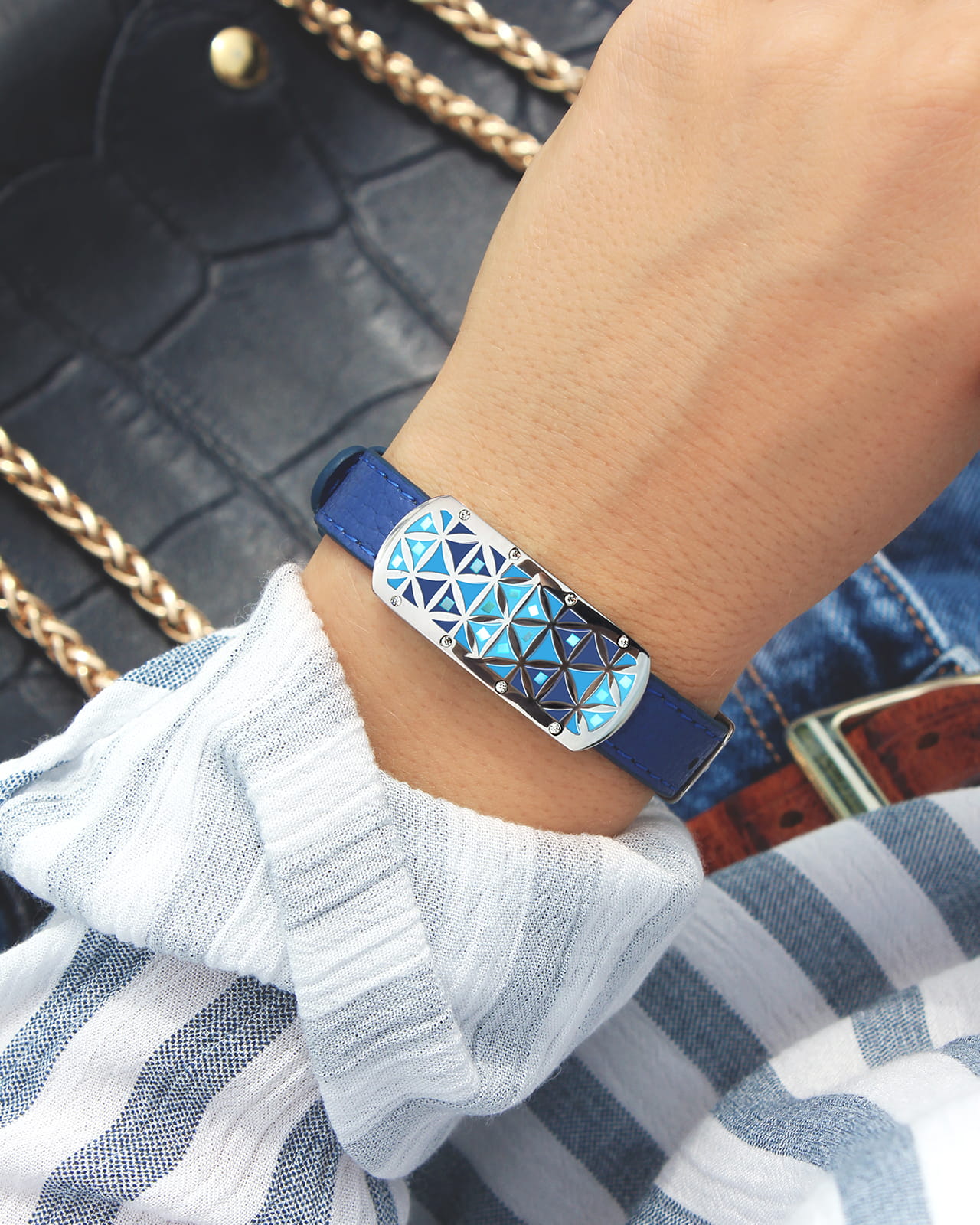Le bleu marine de son bracelet cuir vient sublimer cette pièce riche en signification. Cette couleur intense fait ressortir avec délicatesse l'émail de ce bijou.