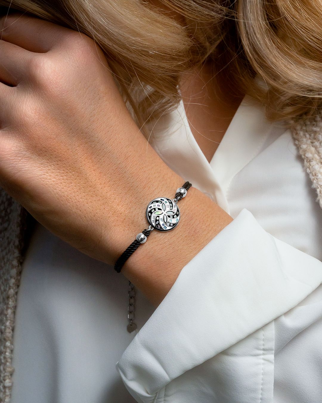 La couleur de son acier met en avant la mosaïque de noir et de blanc incrustée de fines feuilles de nacre aux reflets irisés qui apportera un vrai plus à vos tenues !