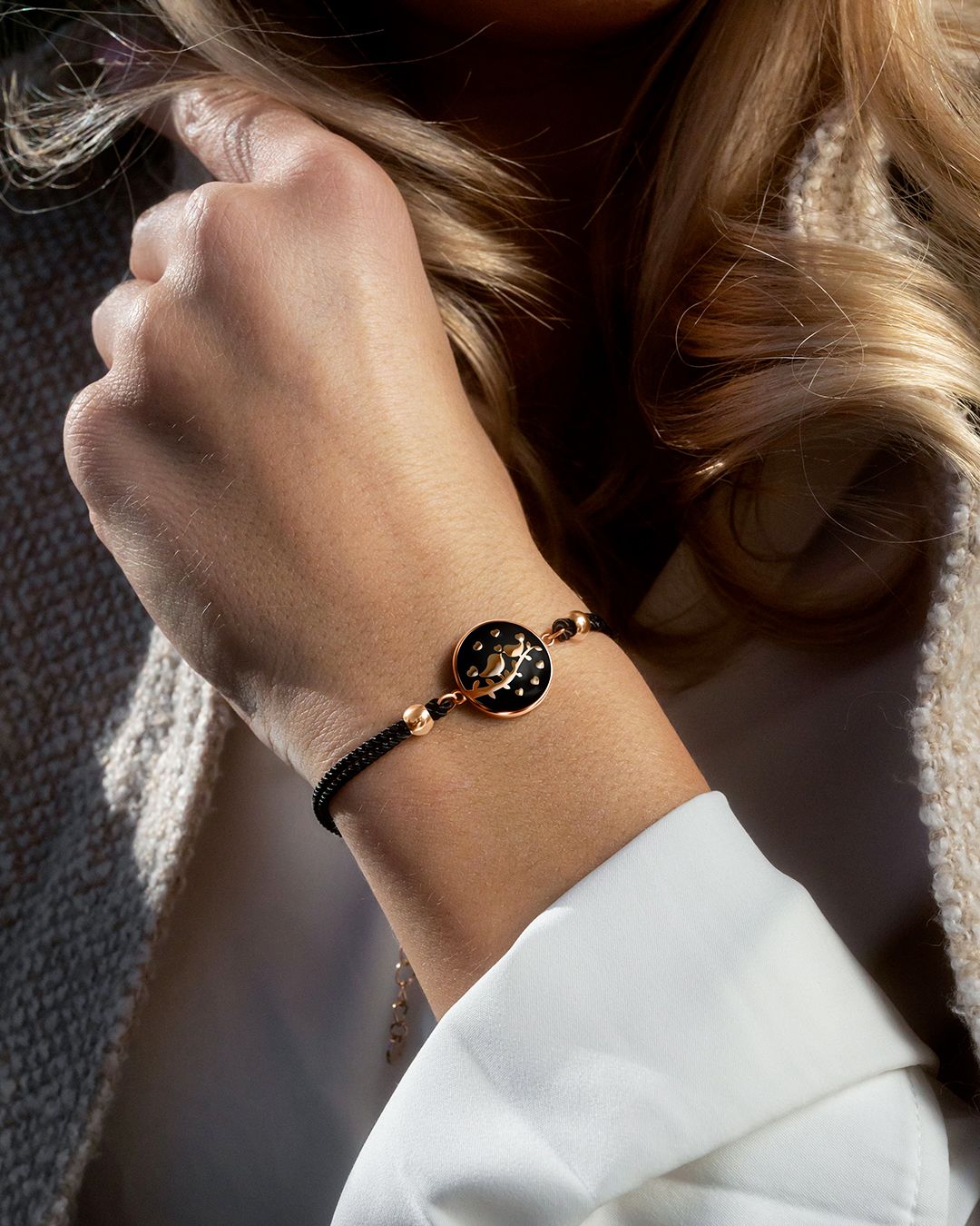 Le noir intense de son bracelet coton fait ressortir avec élégance l'émail de ce bijou. Il se mariera à la perfection avec chacune de vos tenues.