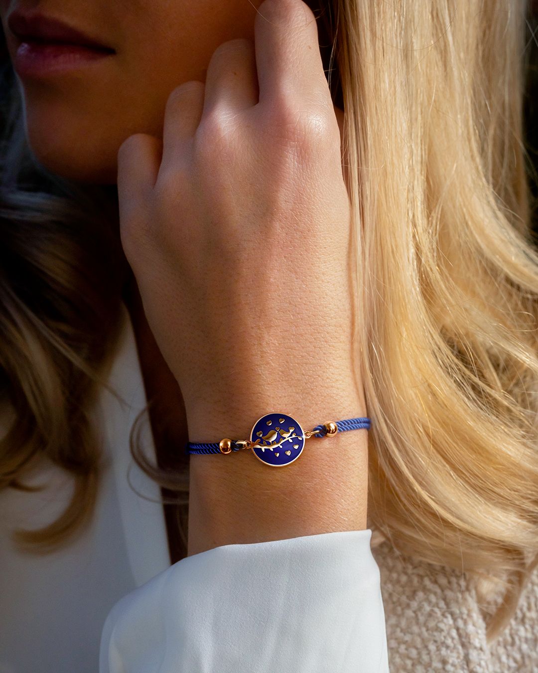 Le bleu de son bracelet coton fait ressortir avec élégance l'émail de ce bijou. Il se mariera à la perfection avec chacune de vos tenues.
