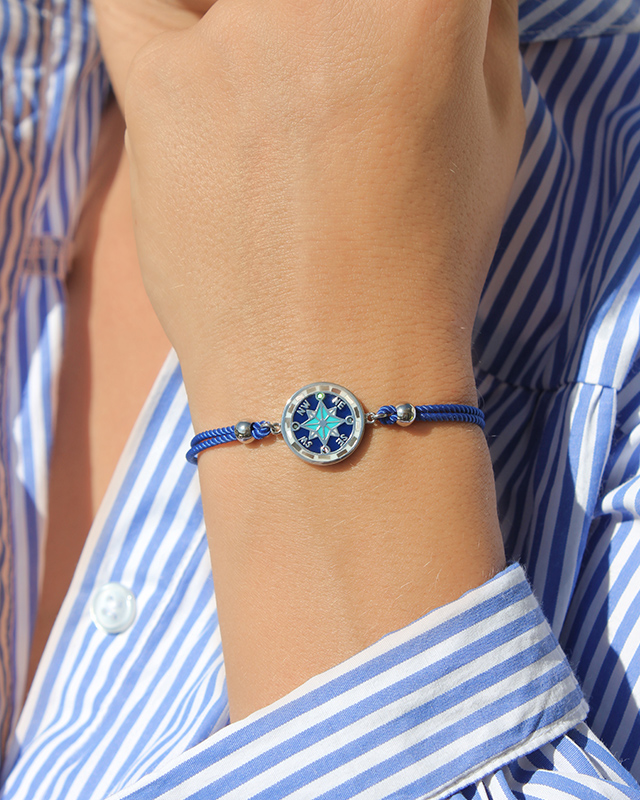 L'intense bleu foncé de son bracelet en coton se marie à la perfection avec l'acier de ce bijou pour un rendu unique.