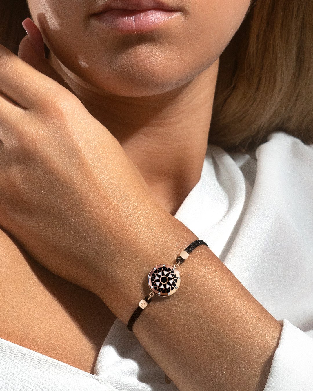Son bracelet en coton combiné à sa chaîne viendra somptueusement s'allier avec vos looks du quotidien.