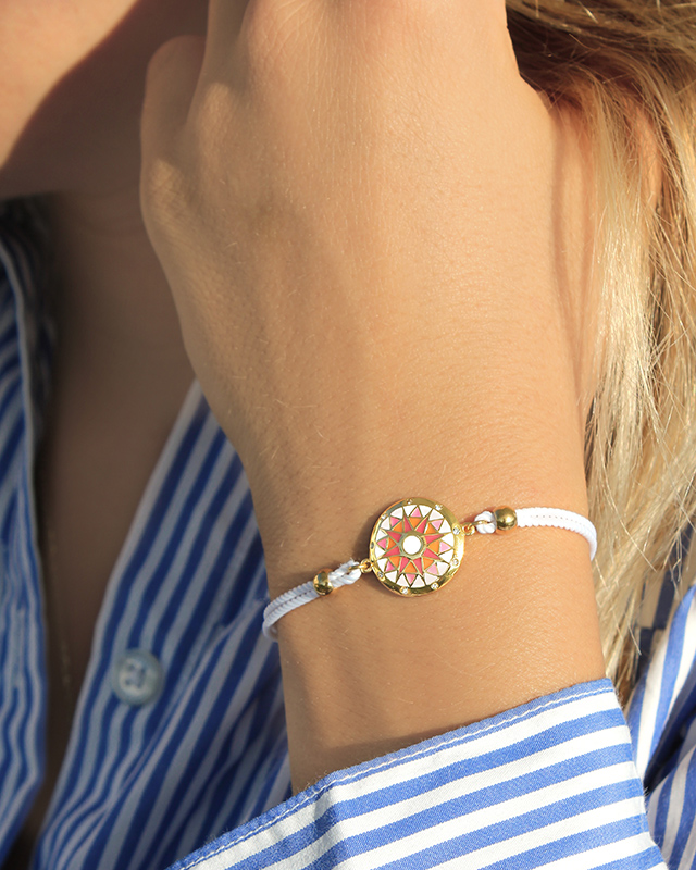 Le blanc de son bracelet coton illumine la beauté de ce bijou unique.
