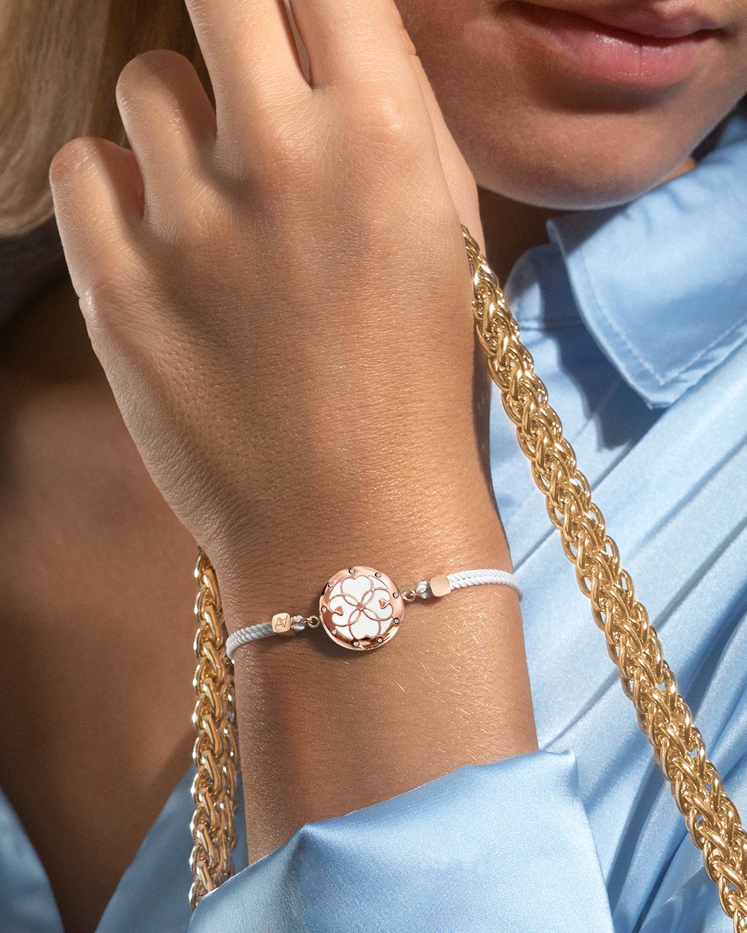 Son bracelet en coton combiné à sa chaîne viendra somptueusement s'allier avec vos looks du quotidien.