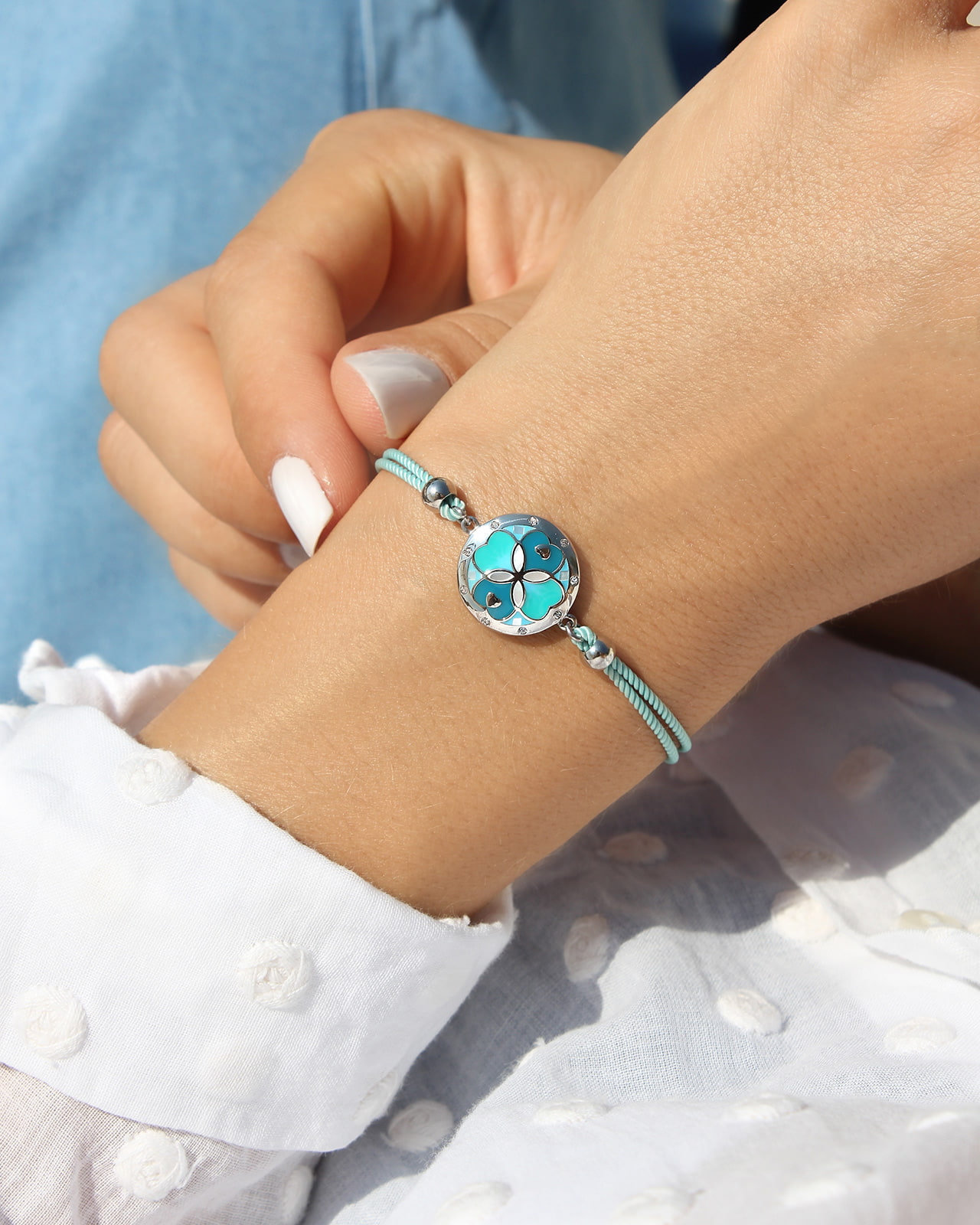 Le bleu gris du bracelet coton se marie à la perfection avec la finesse de son bijou.