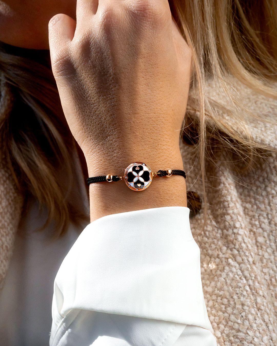 Le noir intense de son bracelet coton fait ressortir avec élégance les détails du médaillon, et viendra sublimer toutes vos tenues.