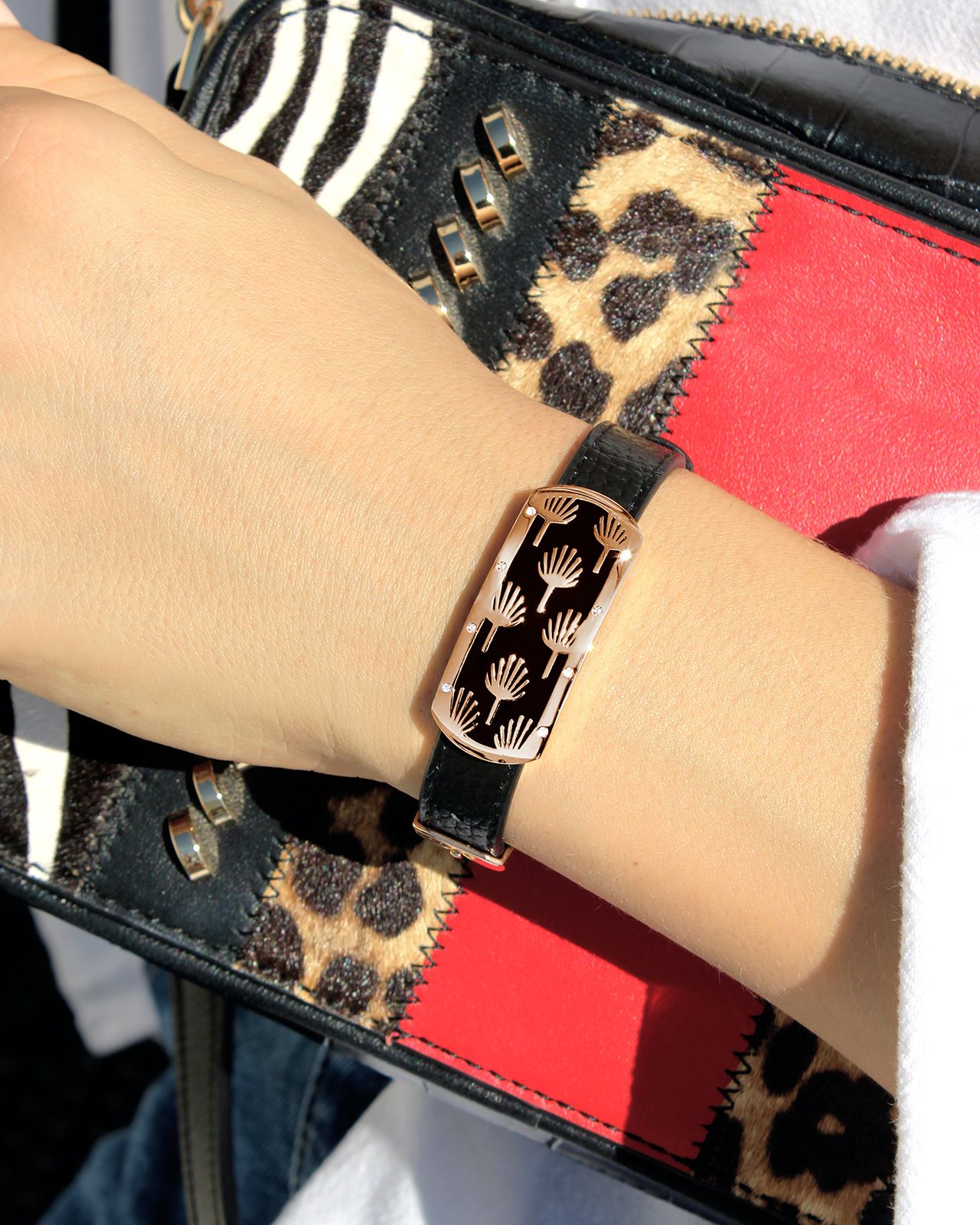 Le noir de son bracelet cuir sublime l'acier rosé du bijou pour en faire un accessoire indispensable.