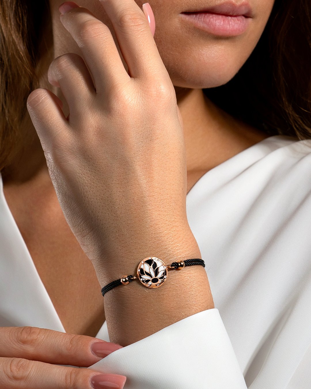Le noir intense de son bracelet coton fait ressortir avec élégance l'émail de ce bijou. Il se mariera à la perfection avec chacune de vos tenues.