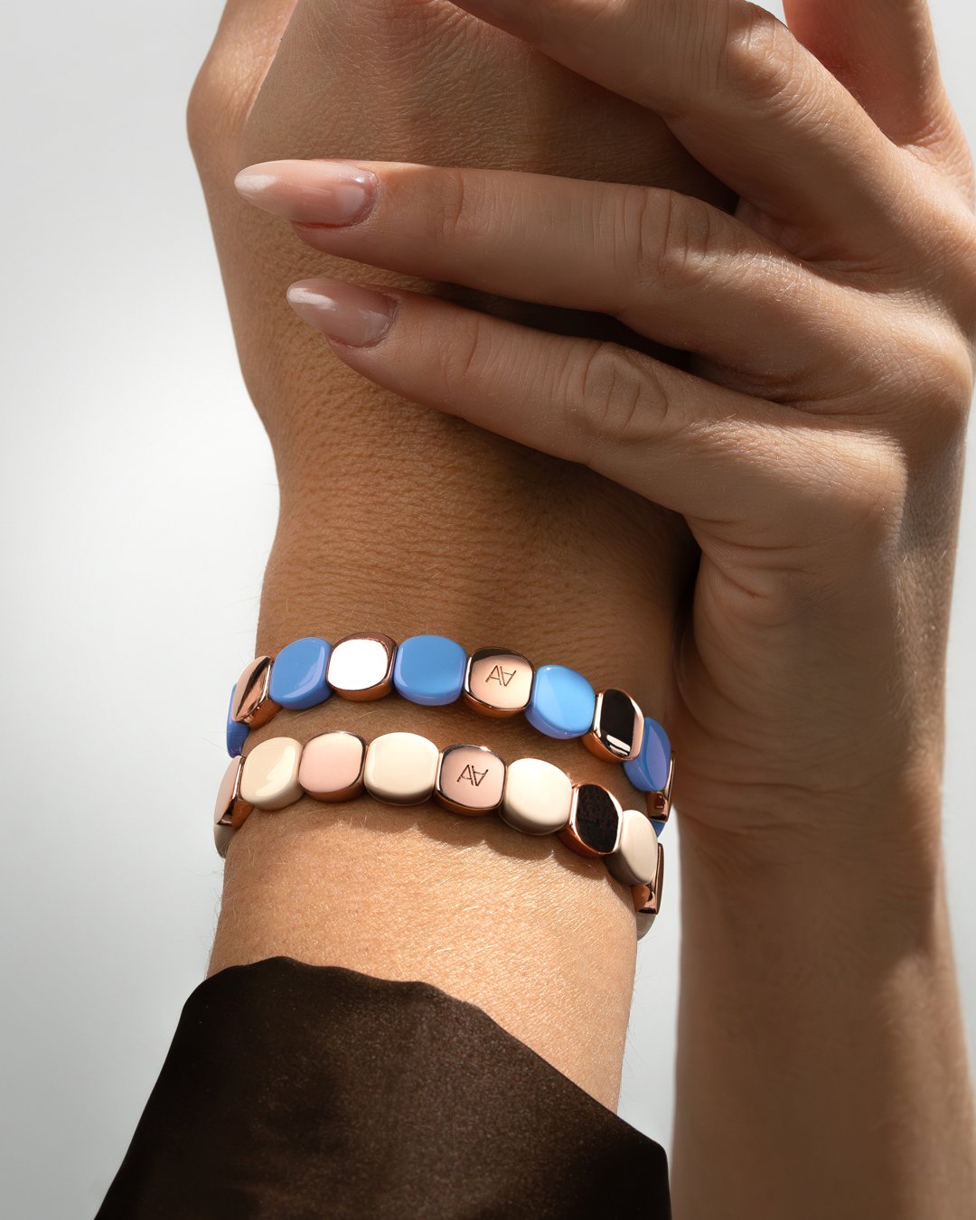 Raffiné et lumineux, il séduit par son jeu d’alternance délicat entre le métal rosé et le métal bleu clair, créant un contraste subtil qui capte la lumière avec grâce.