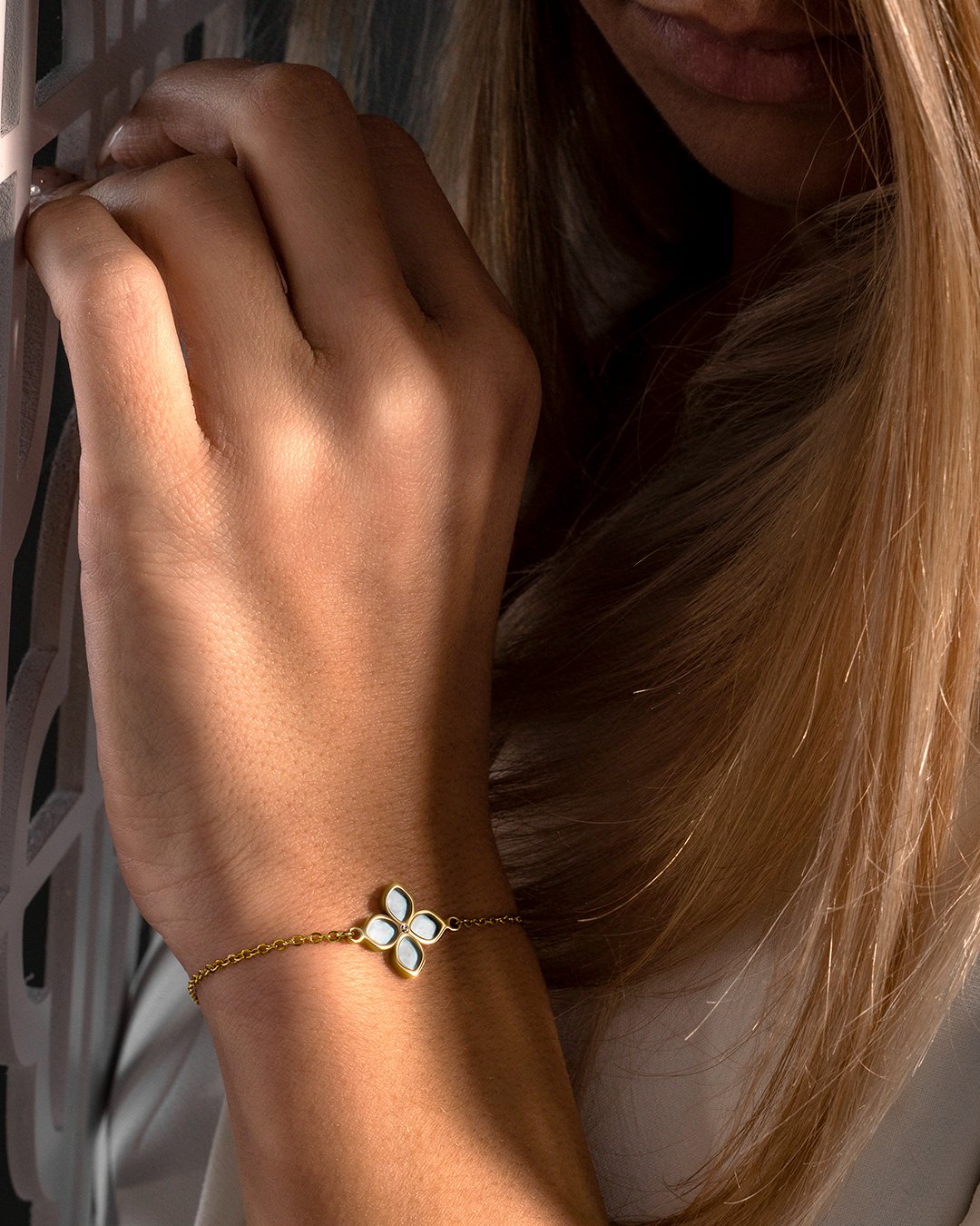 Le bracelet Steletti Doro est composé d'une pièce de nacre sertie d'un strass accompagnée d'une chaînette en acier inoxydable dorée.