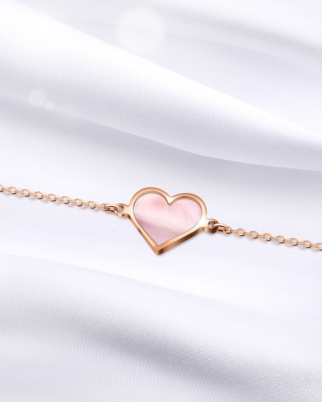 Le bracelet Cuoretti Rosa est composé d'une pièce de nacre accompagnée d'une chaînette en acier inoxydable rosée.