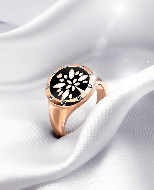La pièce centrale est une pastille signée Anna Velazia en acier doré à l'or fin rosé.