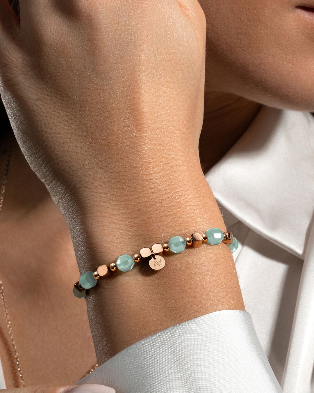 L'élément central de ce bracelet est une pastille signée Anna Velazia, confectionnée à la main, en acier doré à l'or fin rosé.