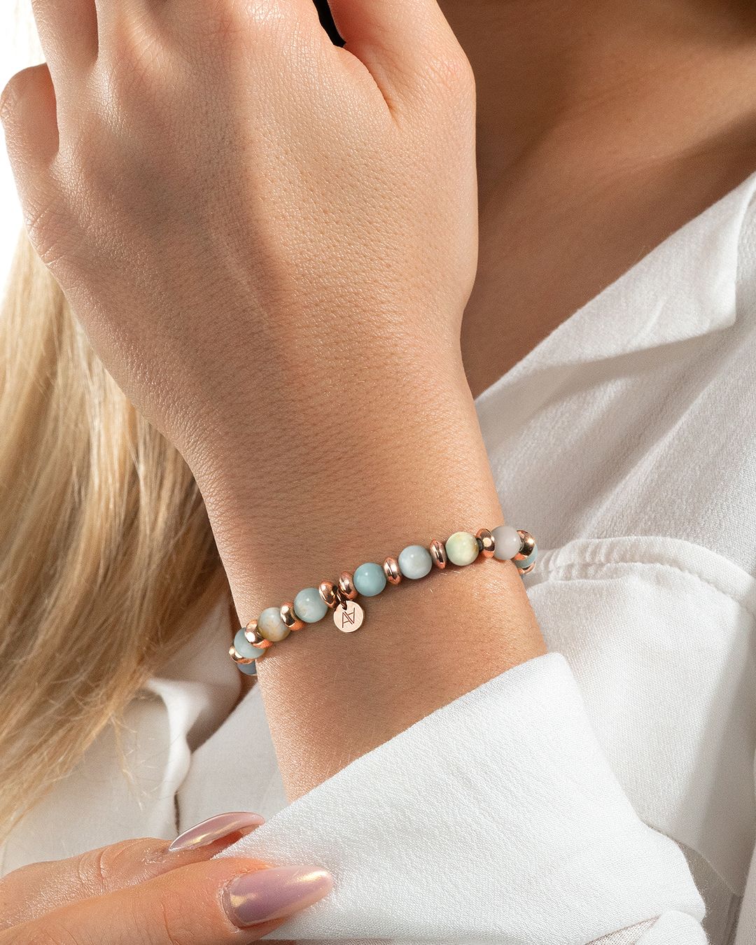 - Matière du bracelet Acier rosé inoxydable et amazonite