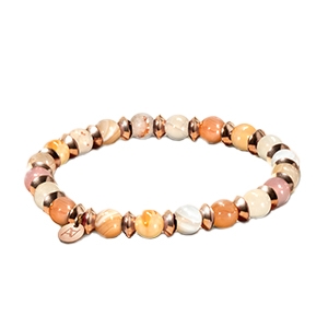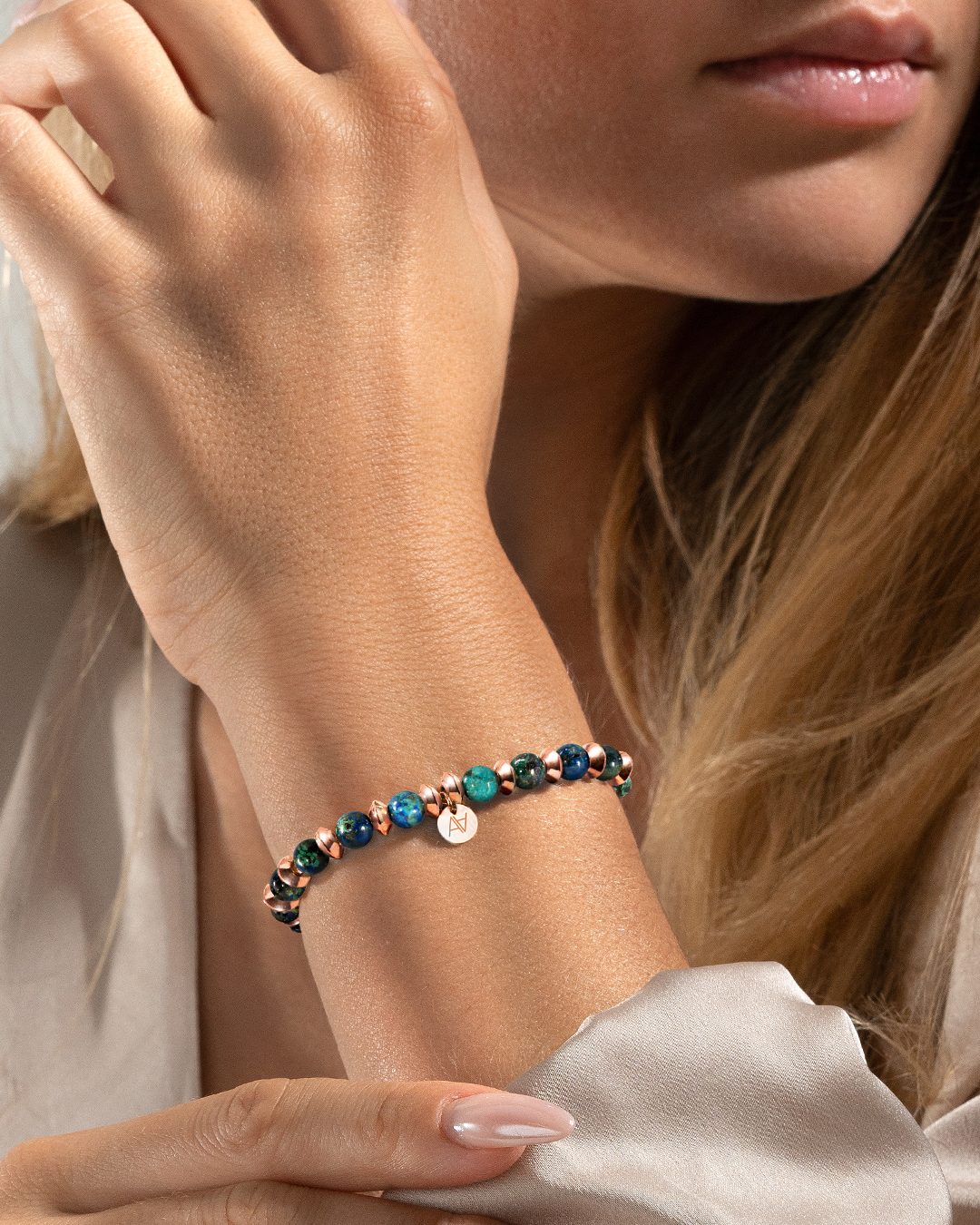 La pièce centrale est une pastille signée Anna Velazia en acier doré à l'or fin rosé, ajoutant une subtile touche de raffinement à votre poignet.