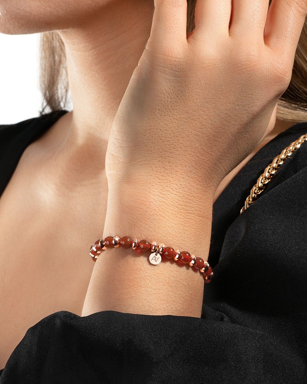 - Matière du bracelet Acier rosé inoxydable et cornaline rouge