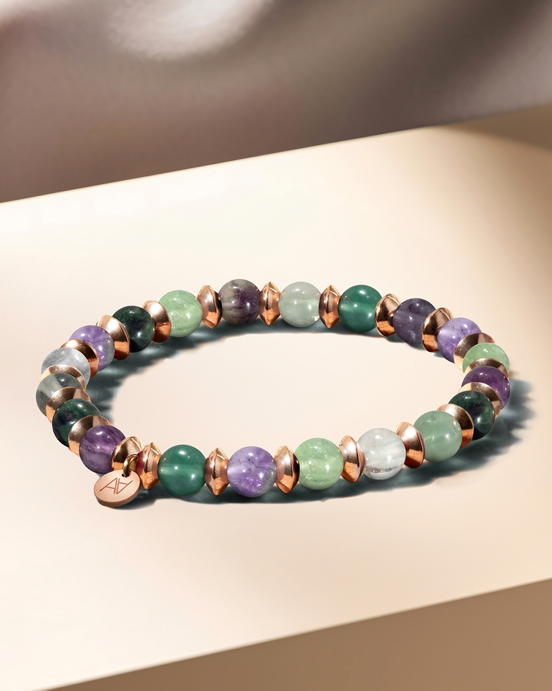 La pièce centrale est un médaillon signé Anna Velazia en acier rosé inoxydable, ajoutant une touche de sophistication raffinée à votre poignet En lithothérapie, la Fluorite est réputée pour ses vertus apaisantes, favorisant la clarté mentale, la concentration et la protection contre les énergies négatives.
