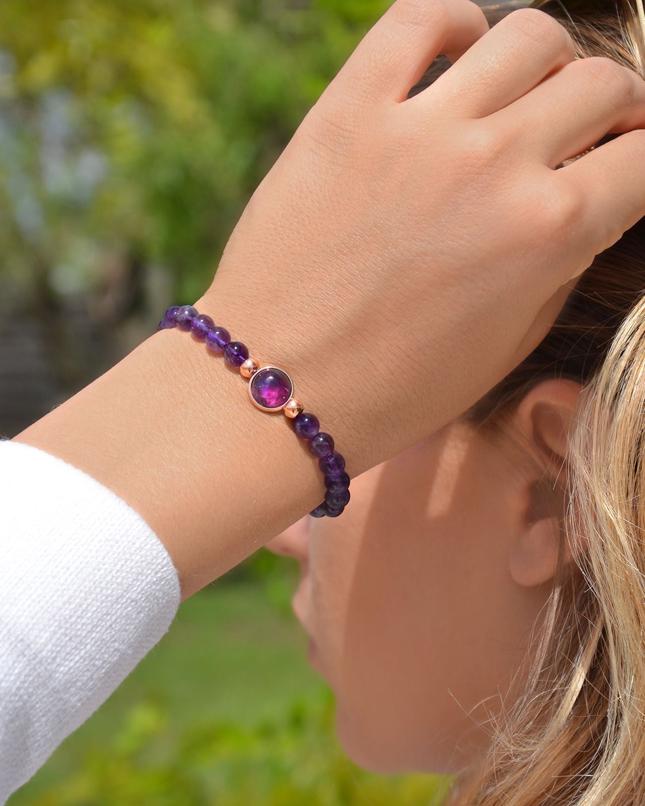 L'Améthyste symbolise la sagesse, l'humilité et la force. Elle s'occupe d'apaiser soucis, colères et tristesses tout en favorisant la concentration ainsi que l'élévation spirituelle. Elle permet à son porteur d'être plus créatif, serein et clairvoyant. L'améthyste est une pierre purifiante qui favorise la détente. De plus, l'améthyste a une action bénéfique sur le sommeil, elle le rend paisible.