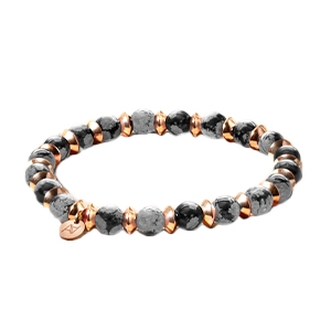 La pièce centrale est une pastille signée Anna Velazia en acier doré à l'or fin rosé, ajoutant une subtile touche de raffinement à votre poignet.