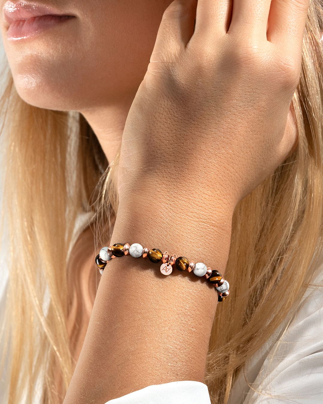 - Matière du bracelet Acier rosé inoxydable et howlite et Oeil de tigre
