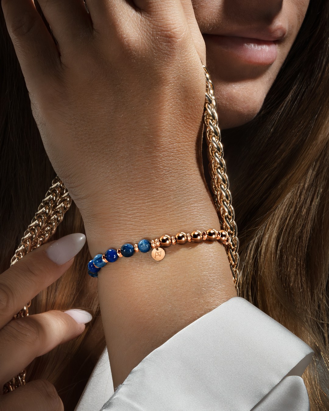 La kyanite, reconnue pour ses vertus équilibrantes et purificatrices, est souvent associée à l'harmonisation des énergies et à l'ouverture de la communication. Elle favorise la clarté mentale, la sérénité et la compréhension spirituelle, tout en facilitant l'expression des émotions et des pensées. En contraste, les boules en acier rosé inoxydable ajoutent une touche de sophistication et de brillance contemporaine. Cette combinaison unique incarne l'équilibre parfait entre nature et modernité, offrant à votre poignet une élégance intemporelle et une énergie apaisante.