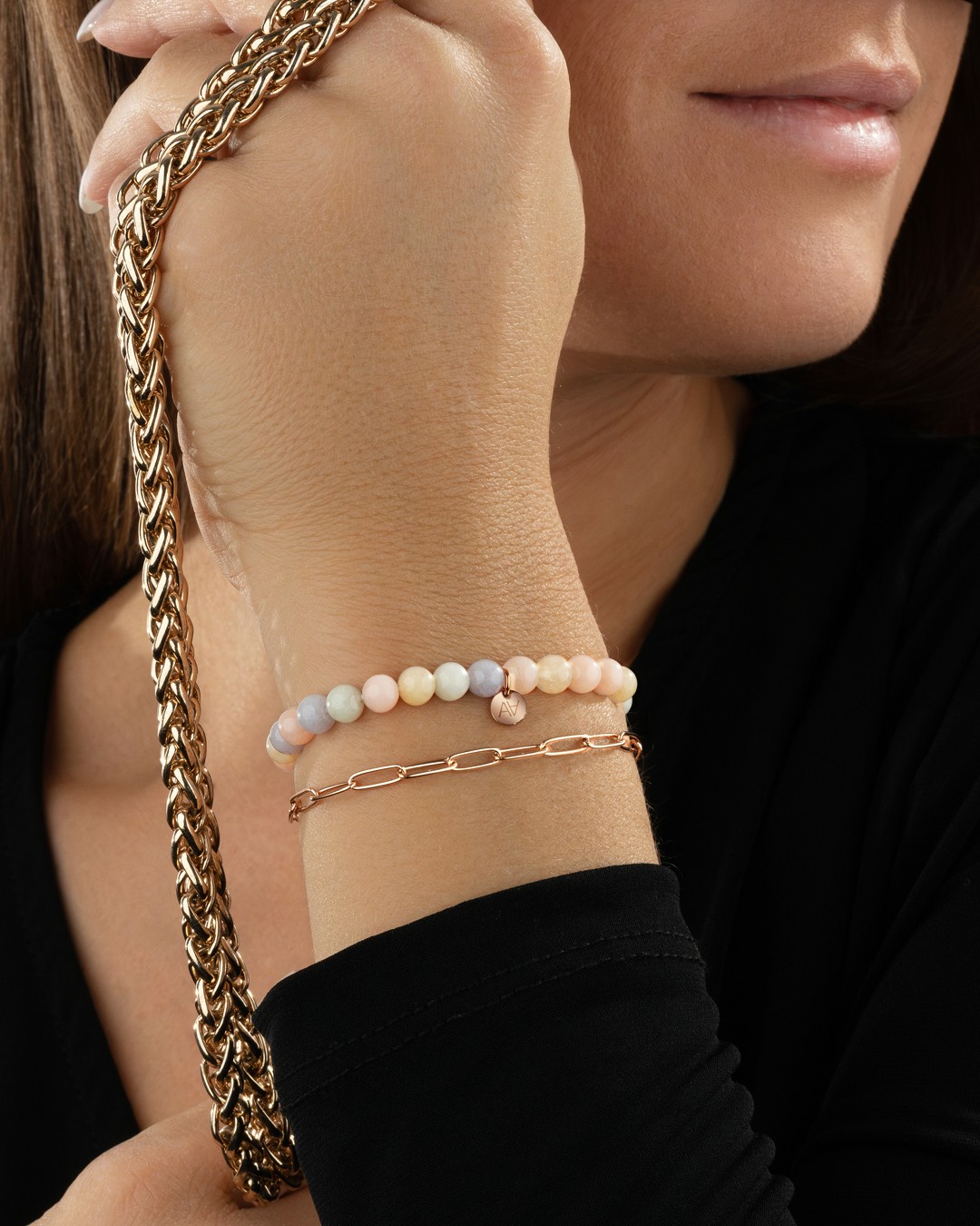 Ce bracelet en pierres naturelles de la collection Les Originelles étant composé exclusivement de morganite, une attention toute particulière a été donnée sur le choix des pierres qui le composent.