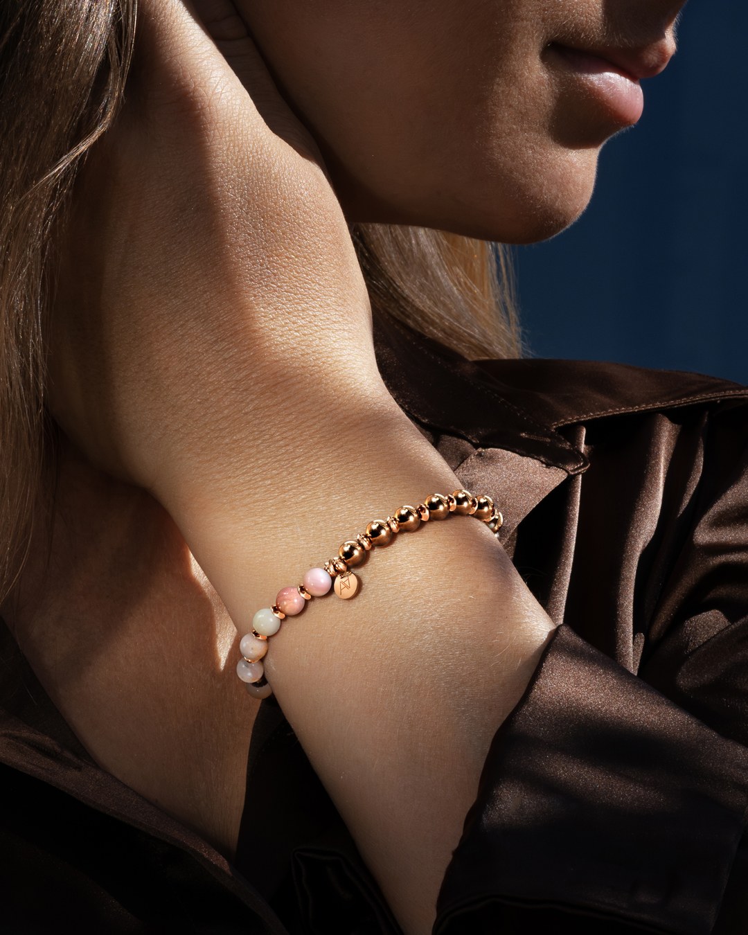 En contraste, les boules en acier rosé inoxydable ajoutent une touche de sophistication et de brillance contemporaine. Cette combinaison unique incarne l'équilibre parfait entre nature et modernité, offrant à votre poignet une élégance intemporelle et une énergie positive.