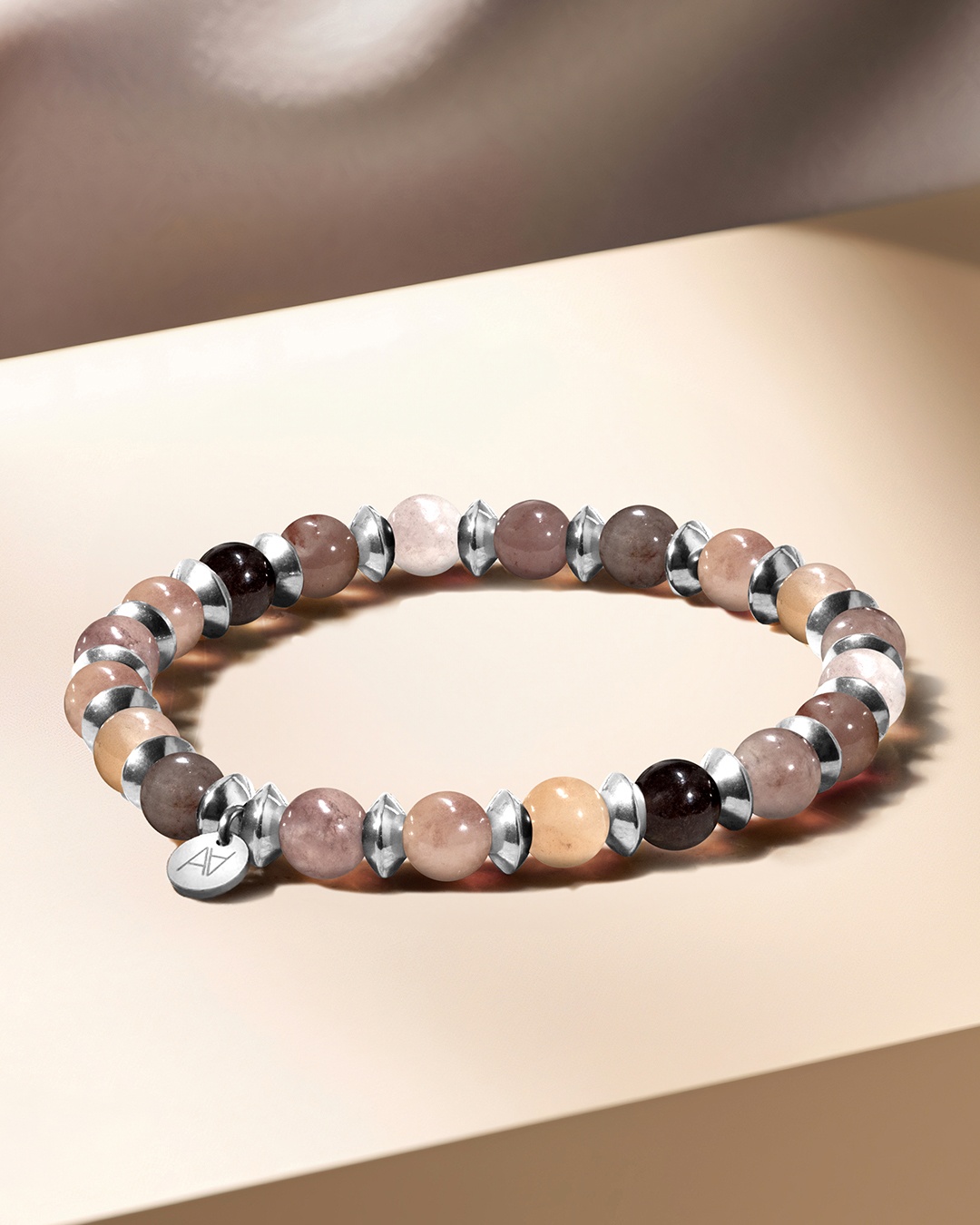 La pièce centrale est une pastille signée Anna Velazia en acier argenté inoxydable, ajoutant une subtile touche de raffinement à votre poignet.