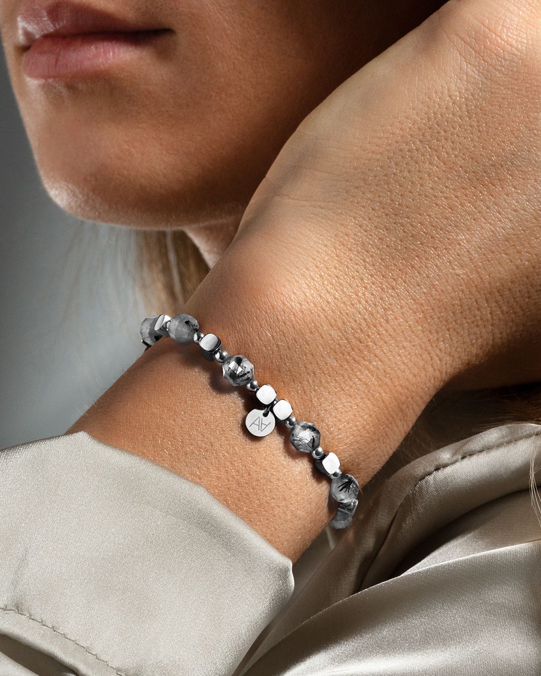 L'élément central de ce bracelet est une pastille signée Anna Velazia, confectionnée à la main, en acier argenté.