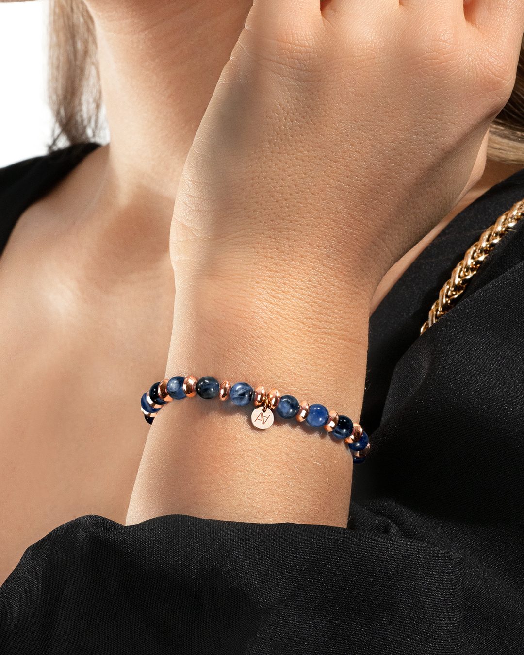 La pièce centrale est un médaillon signé Anna Velazia en acier rosé inoxydable, qui apporte une touche subtile de raffinement à votre poignet.