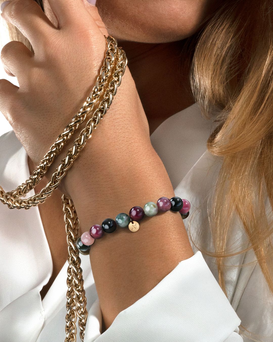 - Matière du bracelet Acier rosé inoxydable et tourmaline multicolore
