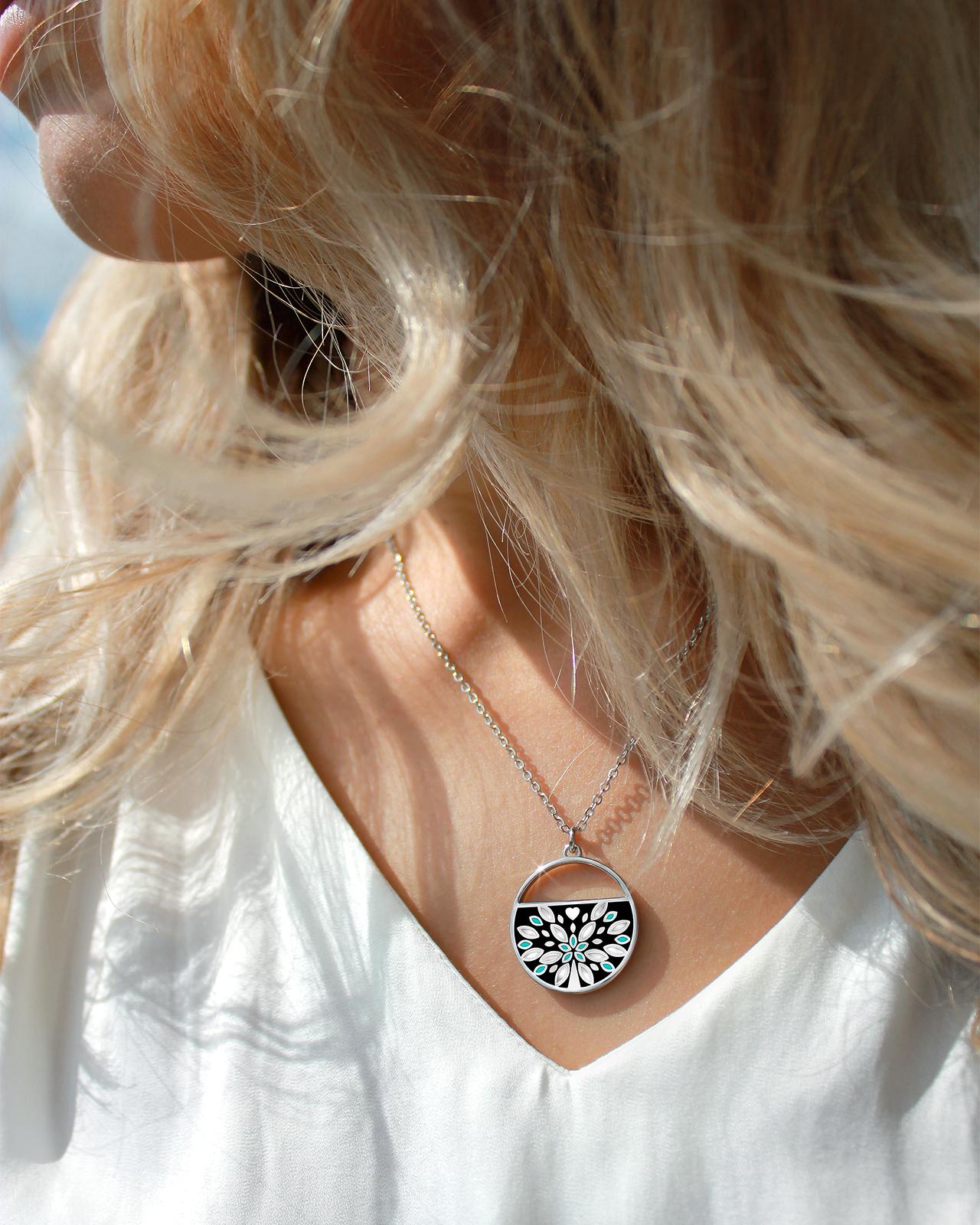 Sa fine chaîne en acier fait ressortir toute la beauté de cet émail riche en signification.