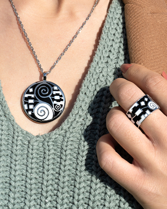 Sa forme ronde fait ressortir parfaitement ses couleurs noires et blanches qui donnent de l'intensité et du caractère à ce pendentif.
