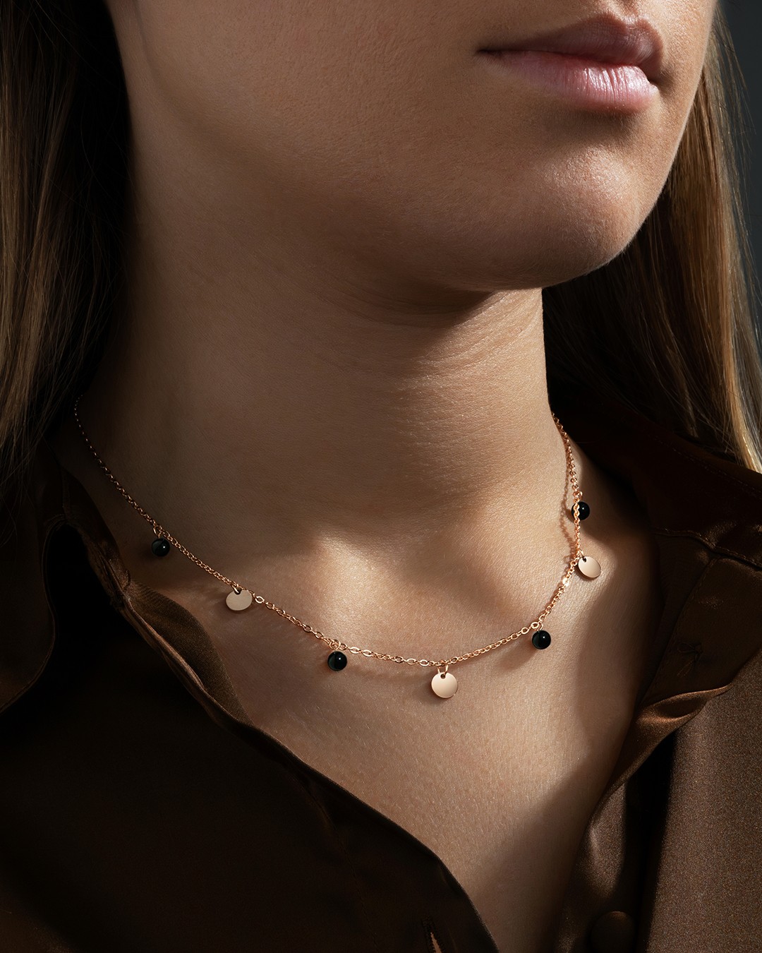 Le collier Leonessotto met en valeur 4 magnifiques pierres en tourmaline noire, soigneusement disposées entre des pampilles en acier rosé inoxydable, signées Anna Velazia.